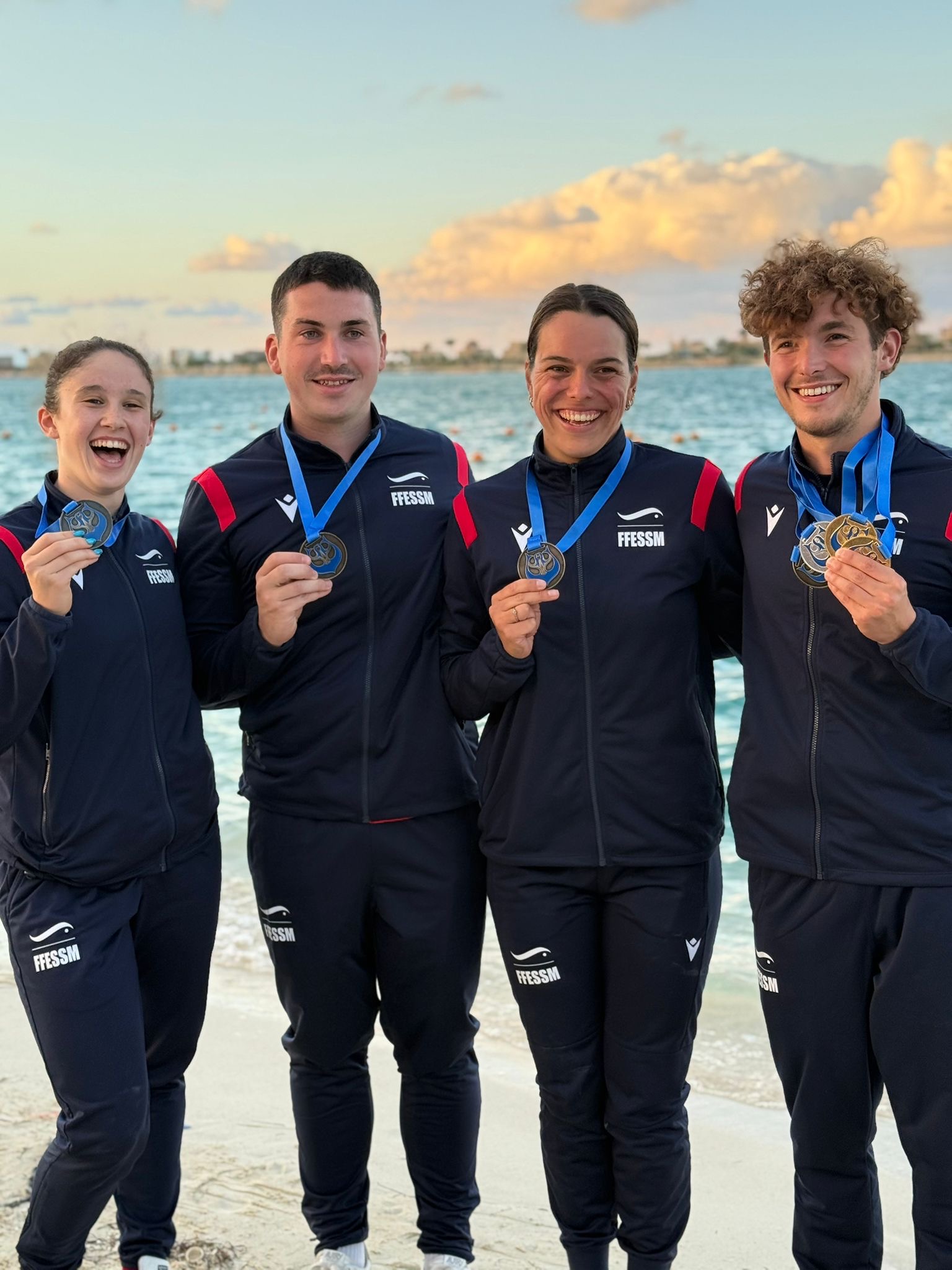 World Champion in the 1 km BI and 3 km BI, silver medalist in the 150 m elimination race, and bronze medalist in the 4x1000 SB relay, the French athlete continues an incredible streak that cements his place among the greatest Finswimmers in history: 11 individual world titles, 3 relay titles, 2 silver medals, and 1 bronze.