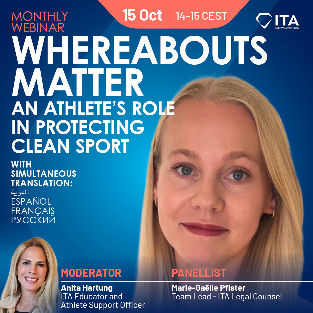 "Whereabouts Matter: An Athlete's Role in Protecting Clean Sport" – featuring Marie-Gaëlle Pfister (Team Lead – ITA Legal Counsel) and moderated by Anita Hartung (ITA Educator and Athlete Support Officer).